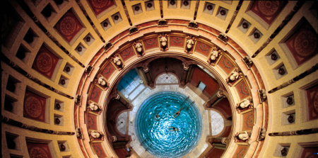 降り注ぐ太陽の光はなんとも幻想的な空間を作り出しています。 ここでの楽しみ方は、まるですごろくのように、 16室ある浴室を巡ることにあります。 各浴室には番号が付いており、それぞれ入浴時間が記されています。 それを1番の浴室から順番に巡って行きます。 サウナやマッサージ、ジェットバスに蒸気浴などあり、 こまを順番に進めるのです。そして最後に休憩室があり、 そこがゴールとなります。